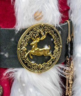 Mit meinem dunkelroten Mantel und der riesigen gold-schwarzen Gürtelschnalle erwecke ich das Wesen des Weihnachtsmanns auf